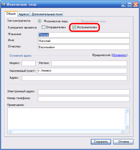 В «Печати конвертов!» в разделе Контрагенты внесите всех сотрудников, которые могут быть назначены исполнителями по входящим документам, не забудьте проставить галочку Исполнитель.