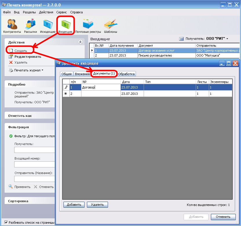 При получении письма создайте запись о входящей корреспонденции в разделе Входящие. При добавлении отметьте полученные документы на вкладке Документы.