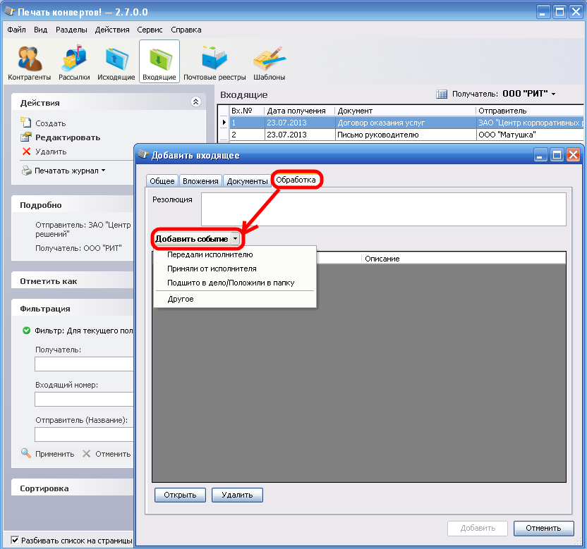 А на вкладке Обработка добавьте события, которые произошли с документом (Передали исполнителю, Приняли от исполнителя, Подшито в дело/Положили в папку), вы можете создать свое событие. Сохраните запись.