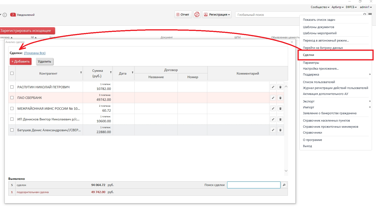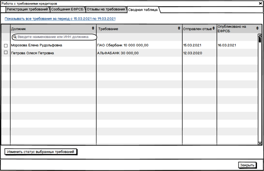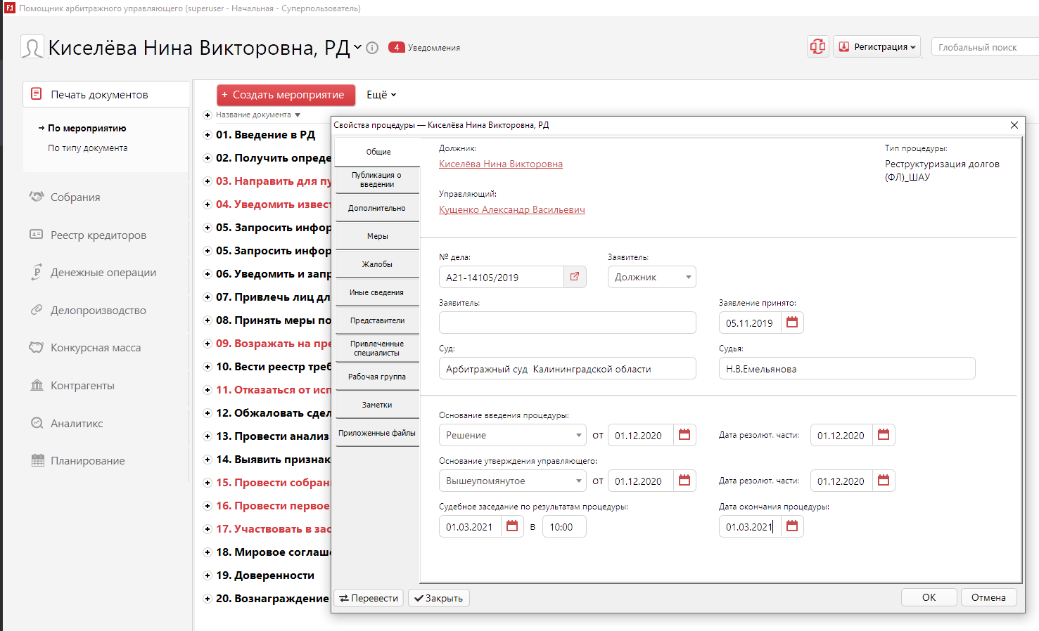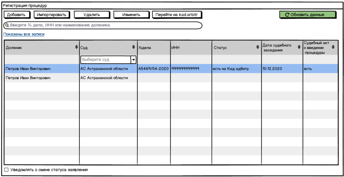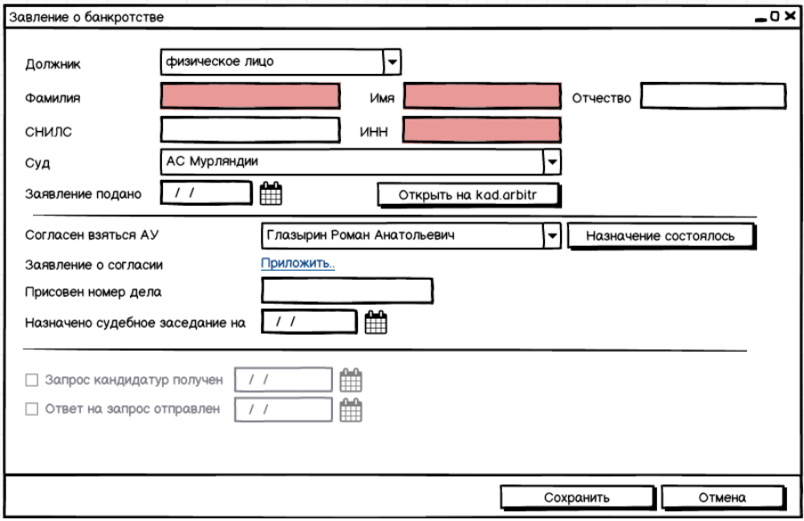 - зарегистрировать поданное заявление (суд, должник, инн, огрн, снилс)