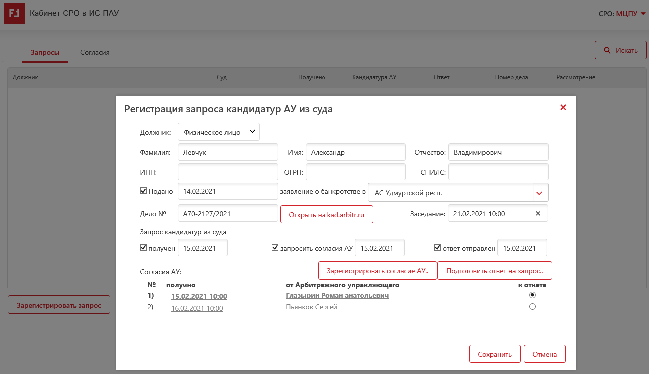 - СРО соответственно при получении запроса суда на предоставление кандидатуры в своём кабинете быстро находят с подачи какого АУ это прилетело, видят его заявление о согласии и готовят ответ в суд