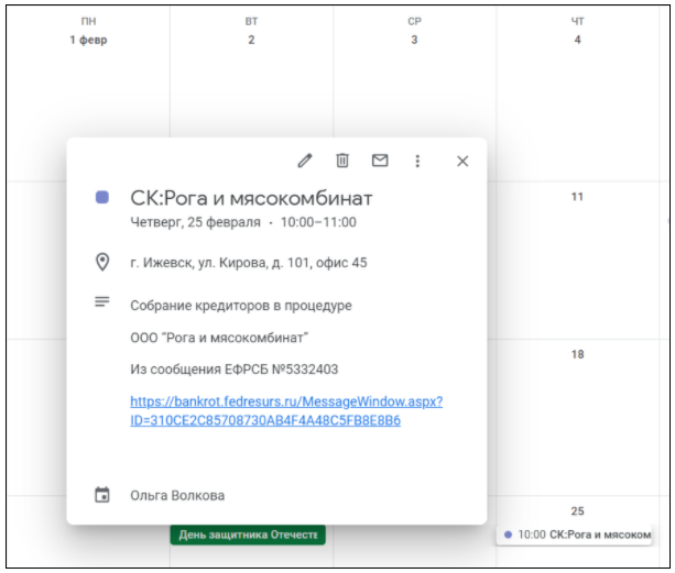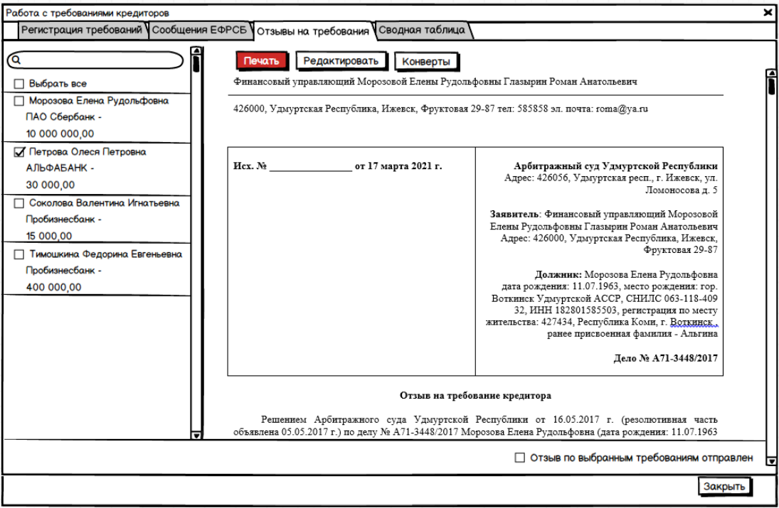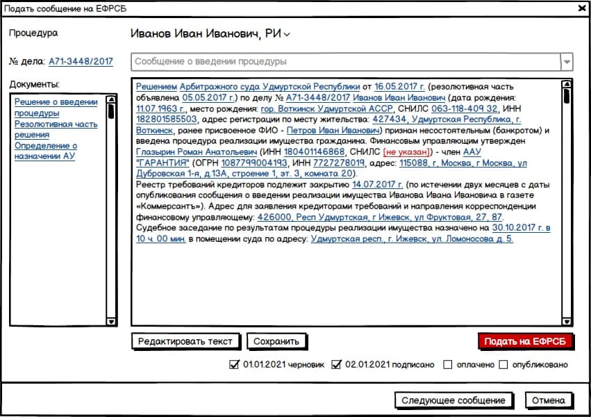 Конечно всё это мы можем обеспечить всякими дополнительными мелочами, вроде подготовки по шаблонам и документов о согласии АУ и ответа СРО в суд, и уведомлениями АУ о том что запрос из суда пришёл и о том что СРО ответило его кандидатурой.