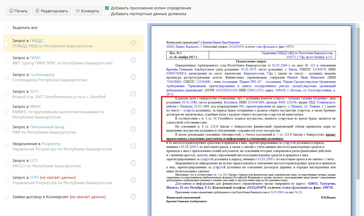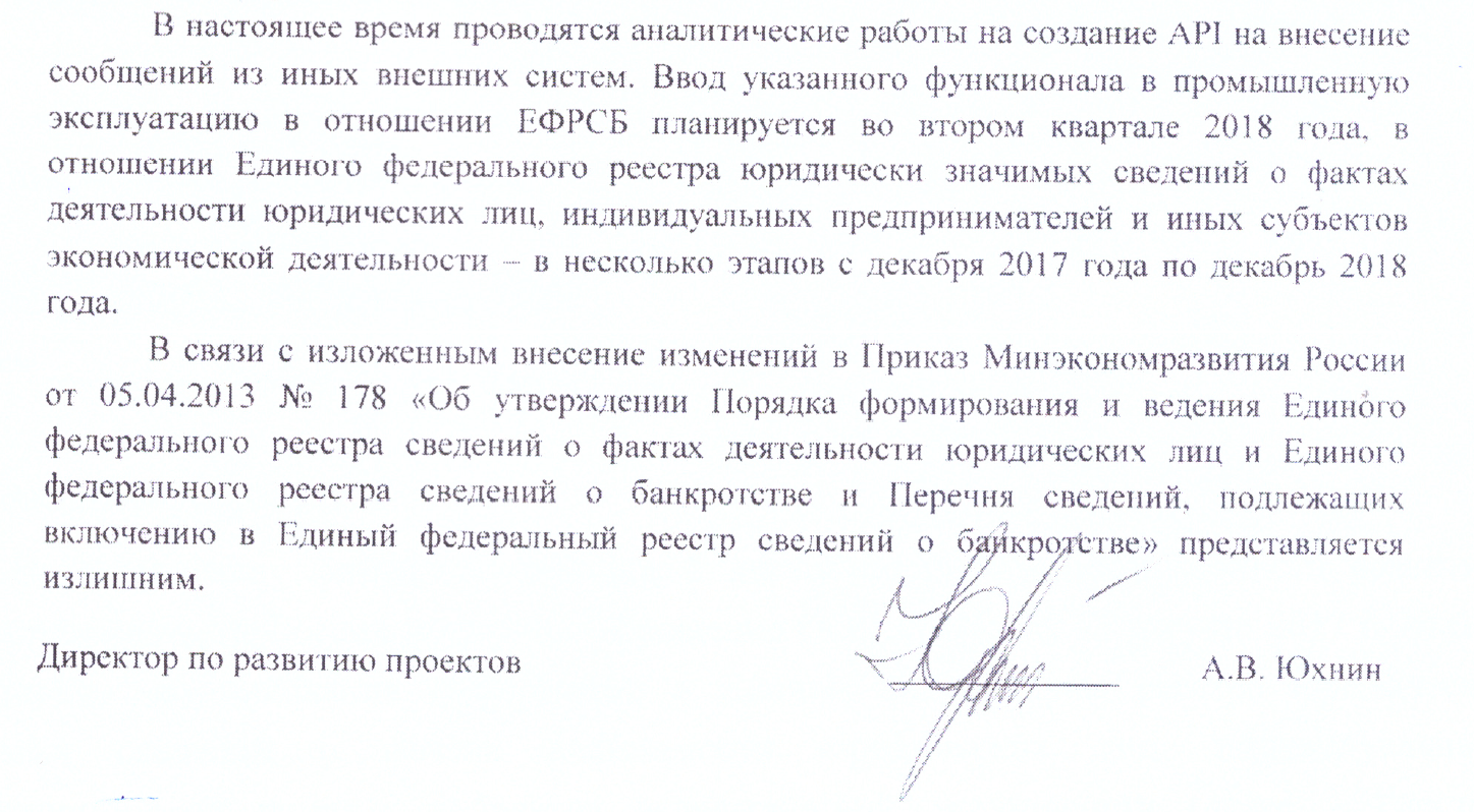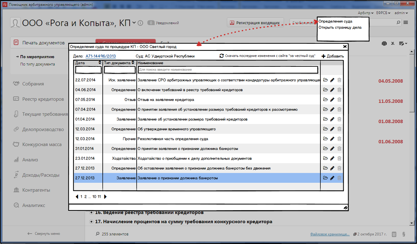 В принципе уже сейчас при регистрации процедуры по определению суда это самое определение можно бы где то и сохранить чтобы потом по потребности можно было распечатывать, скажем как приложение к запросам в контролирующие органы.