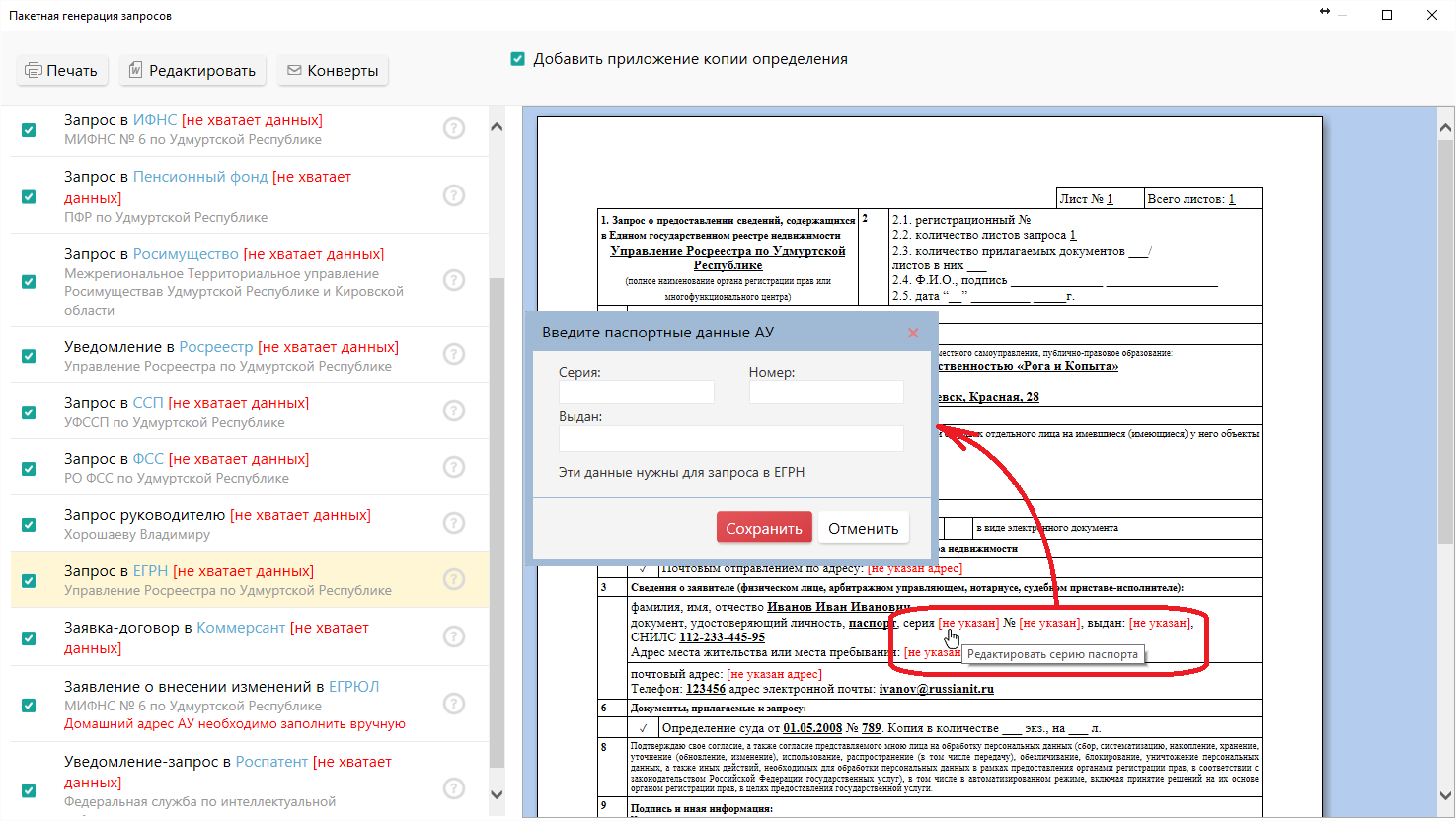 Можно прямо при генерации документов дать возможность указать недостающую информацию,