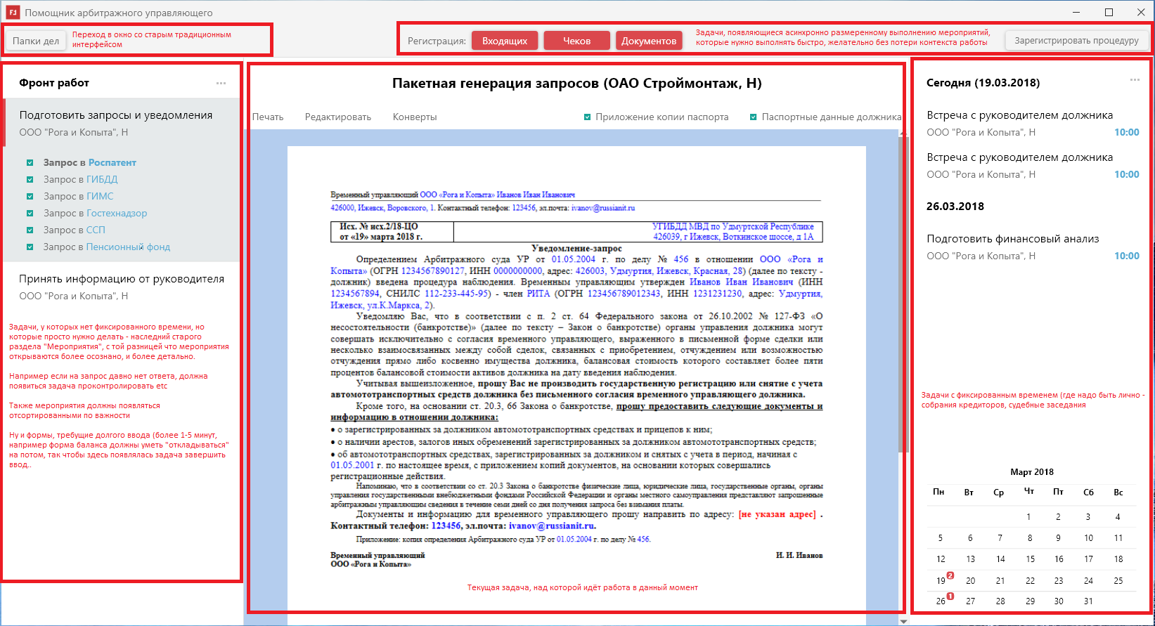 2. Видеть для текущей задачи рабочее поле выполнения - собственно большую часть экрана должна занимать эта часть.. Причём она должна быть не "Модальной", т.е. когда открыл и пока всё не ввёл не можешь закрыть.. а она должна позволять откладывать заполнение "на потом" например сначала зарегистрировали что пришёл ответ от ФНС.. сразу появились во фронте работ задачи на ввод банковских счетов и балансов.. и они там висеть должны пока не введутся..