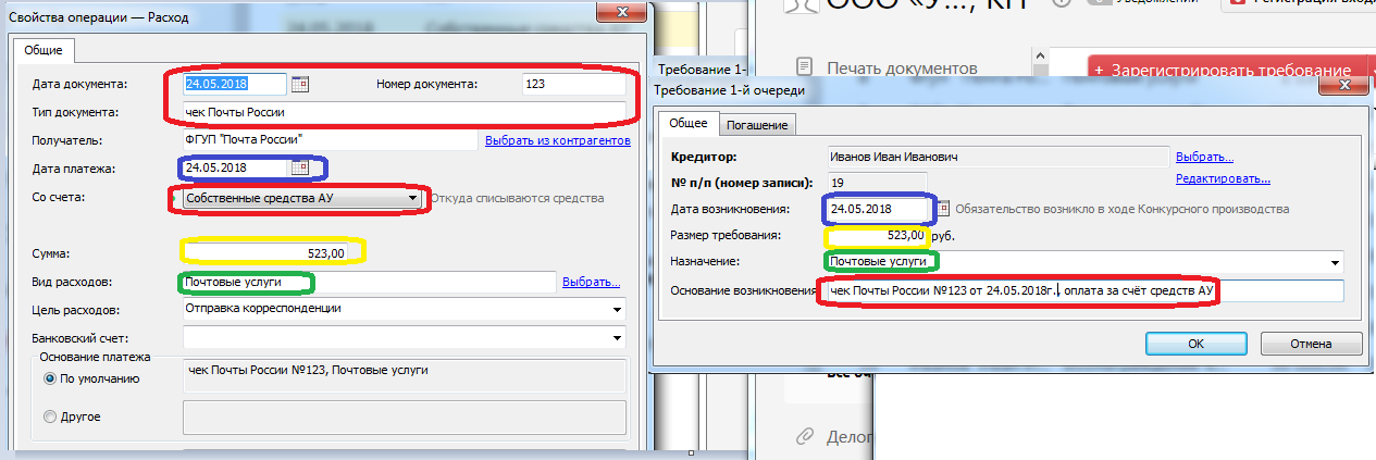 3. В автоматически создаваемое текущее требование подставляются поля из расхода, а при необходимости оно сразу гасится (в данном случае расход с основного счёта, если бы расход был из собственных средств АУ, требование бы автоматически не гасилось). Чтобы видеть и контролировать погашение мы даже "развернули" две старые вкладку в одну..