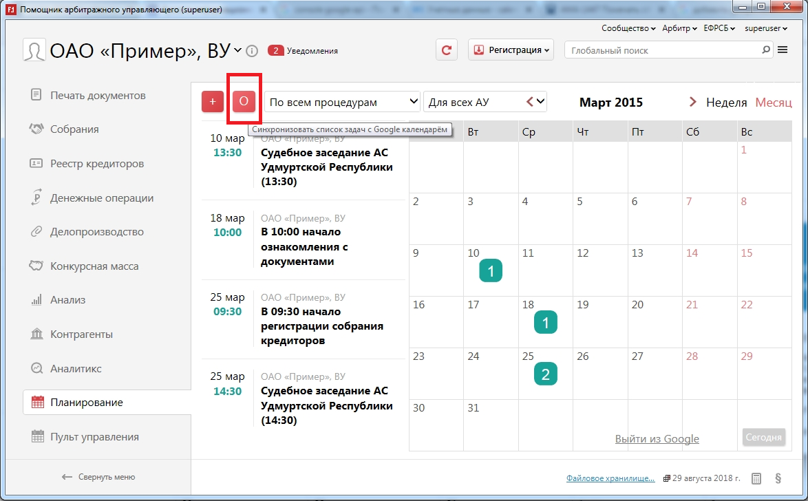 Полгода назад мы добавили в ПАУ раздел планирования, чтобы отображать на календарь важные события: собрания кредиторов, судебные заседания и т.п.