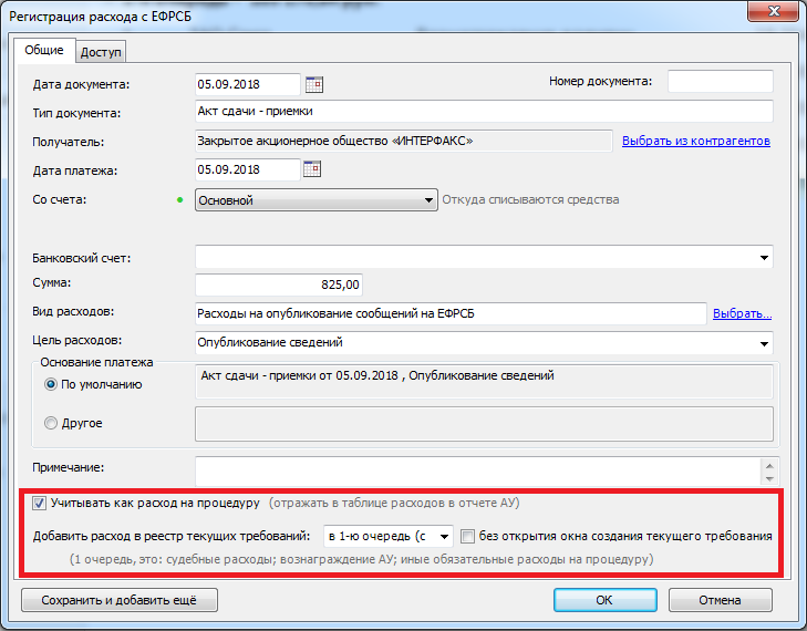 2. Увидели сообщение на ЕФРСБ - ПАУ сразу добавляет черновик расхода на нужную сумму