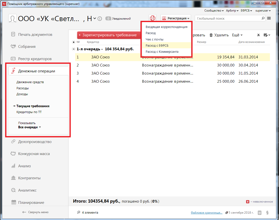 1. Сделан общий раздел "Денежные операции", который объединяет 2 предыдущих "Доходы/расходы" и "Текущие требования". Типовые расходы (почта, еврсб) можно быстро регистрировать прямо из глобального меню