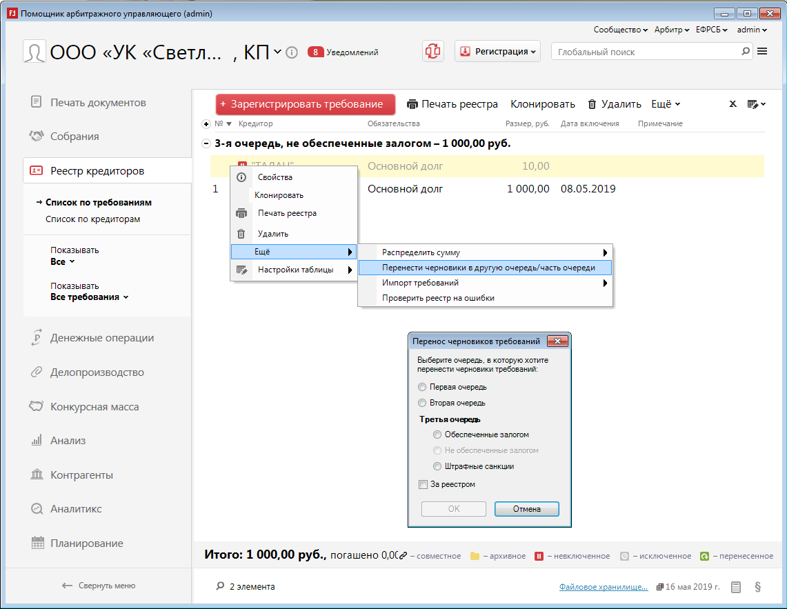 Одной из часто встречаемых проблем при транспортировке требования из судебного акта в ПАУ является неполное распознавание дополнительных параметров требования, а конкретно параметров очереди, в которую это требование нужно поместить (Агент всё таки ориентируется на кредиторов, а они так не заморочены формальными требованиями к реестру). В формате вывода Агента "требование" выдаётся без целого ряда необходимых в реестре параметров, и с несколькими суммами сразу в одной записи (общая сумма, штраф и т.п.). Когда мы видим такие суммы, мы понимаем, в какой очереди требования нам создавать. Если Агент отдаёт нам пустые суммы, мы не можем завести черновик требования. В текущей реализации ПАУ очередь требования должна указываться сразу при создании черновика, и в последствии (при установки крыжика добавить в реестр), менять её нельзя. Другими словами мы сейчас в ПАУ не можем создать черновик требования без очереди, и соответственно черновики из Агента без сумм просто игнорируем. Хотя, возможно, в ближайших релизах или фиксах мы такую возможность добавим.