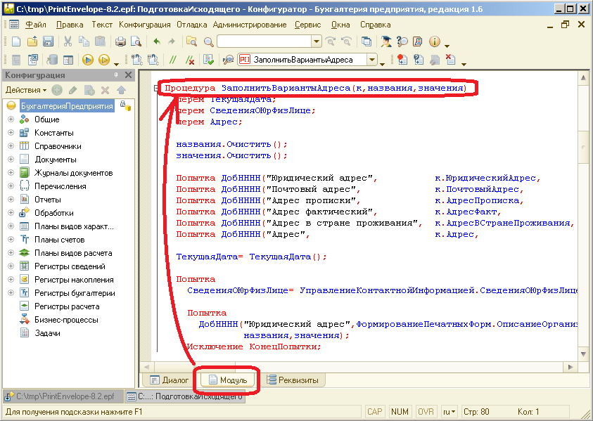 - в открывшейся форме перейти на закладку "Модуль" и найти в тексте процедуру "ЗаполнитьВариантыАдреса"