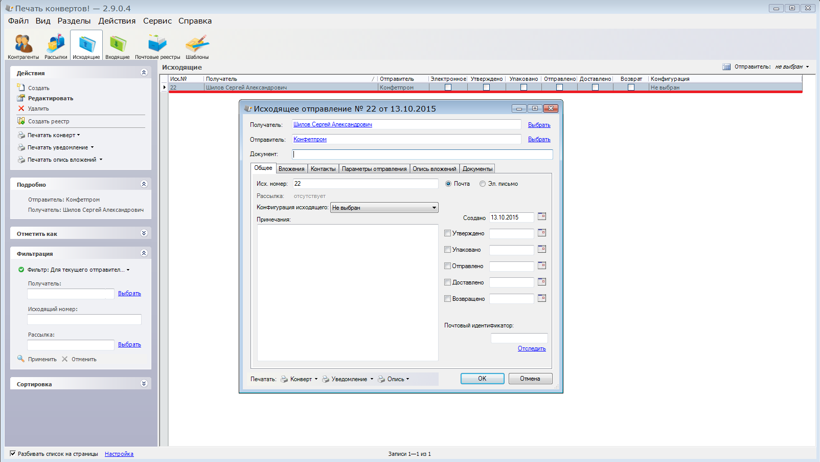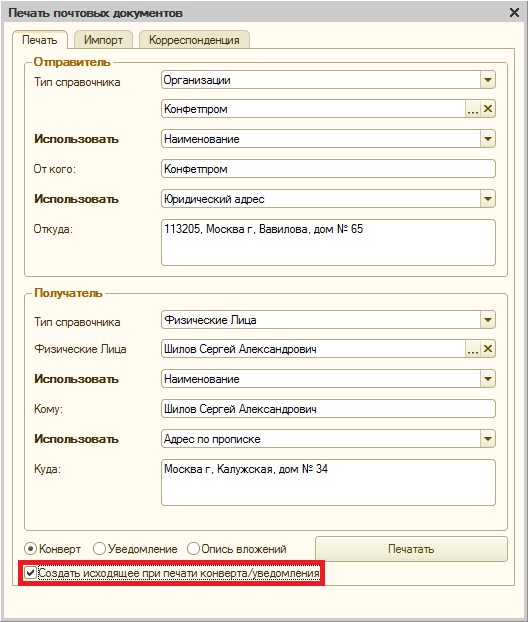 Было бы очень удобно, чтобы обработка печати конвертов из 1с содержала запрос на создание документа в исходящих письмах в программе "Печать конвертов" (т.е. я печатаю конвертик и при этом хочу миновать часть ручного занесения данных в Печати конвертов). Таким образом у меня формируется список исходящих писем (пусть недозаполненных - это можно доделать вручную, главное, что я их все вижу и не заношу вручную новых контрагентов а главное - нет необходимости пытаться запихать весь справочник контрагентов из 1с, я выгружаю их дозированно и автоматически - только тех, кому отправляю письма и только тогда, когда их отправляю). И затем с удовольствием быстро получаю реестр отправленных писем. Спасибо заранее