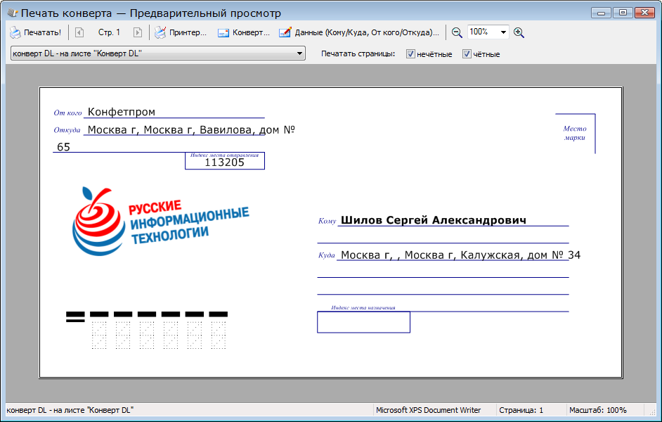 Печать конвертов из 1С v 8.2