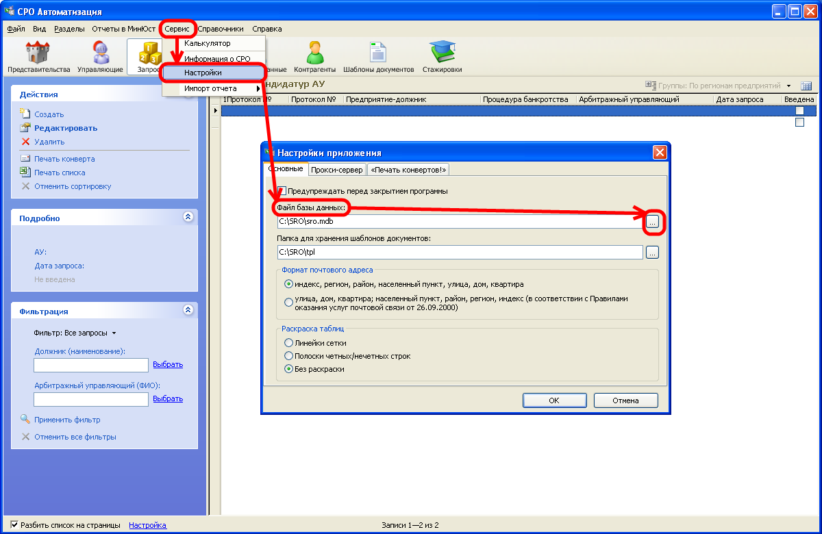 Тестовая база устанавливается по умолчанию в каталог C:\SRO\testdb. Для того, чтобы подключить тестовую базу в программе, необходимо в верхнем горизонтальном меню выбрать Сервис|Настройки. Перед вами появится окно Настройки приложения.