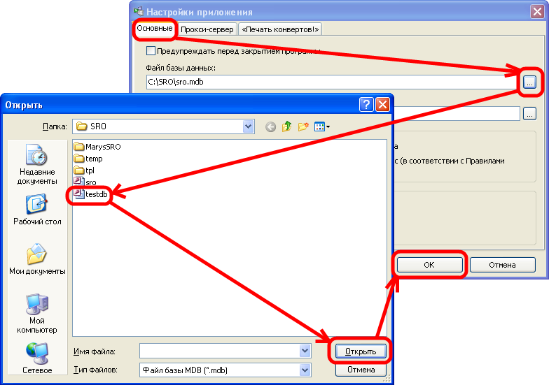 На вкладке Основные можно выбрать файл базы данных, кликнув по иконке справа от поля Файл базы данных. Находим диск С, папку SRO. Выбираем testdb, нажимаем Открыть. Затем в окне Настройки приложения нажимаем Ок.
