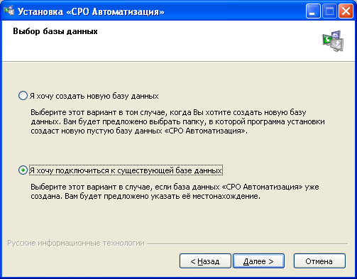- При установке не забудьте выбрать пункт Я хочу подключиться к существующей базе данных. Нажмите Далее.