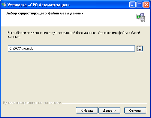 - Программа установки предложит указать путь к подключаемой базе данных. Изначально она лежит здесь C:\SRO\sro.mdb. Выберите этот путь, либо пропишите его вручную. Нажмите Далее.