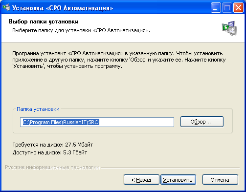 - Выберите папку для установки программы. Установите ее в тот же каталог, в который была установлена старая (по умолчанию это C:\Program Files\RussianIT\SRO). Нажмите Установить.