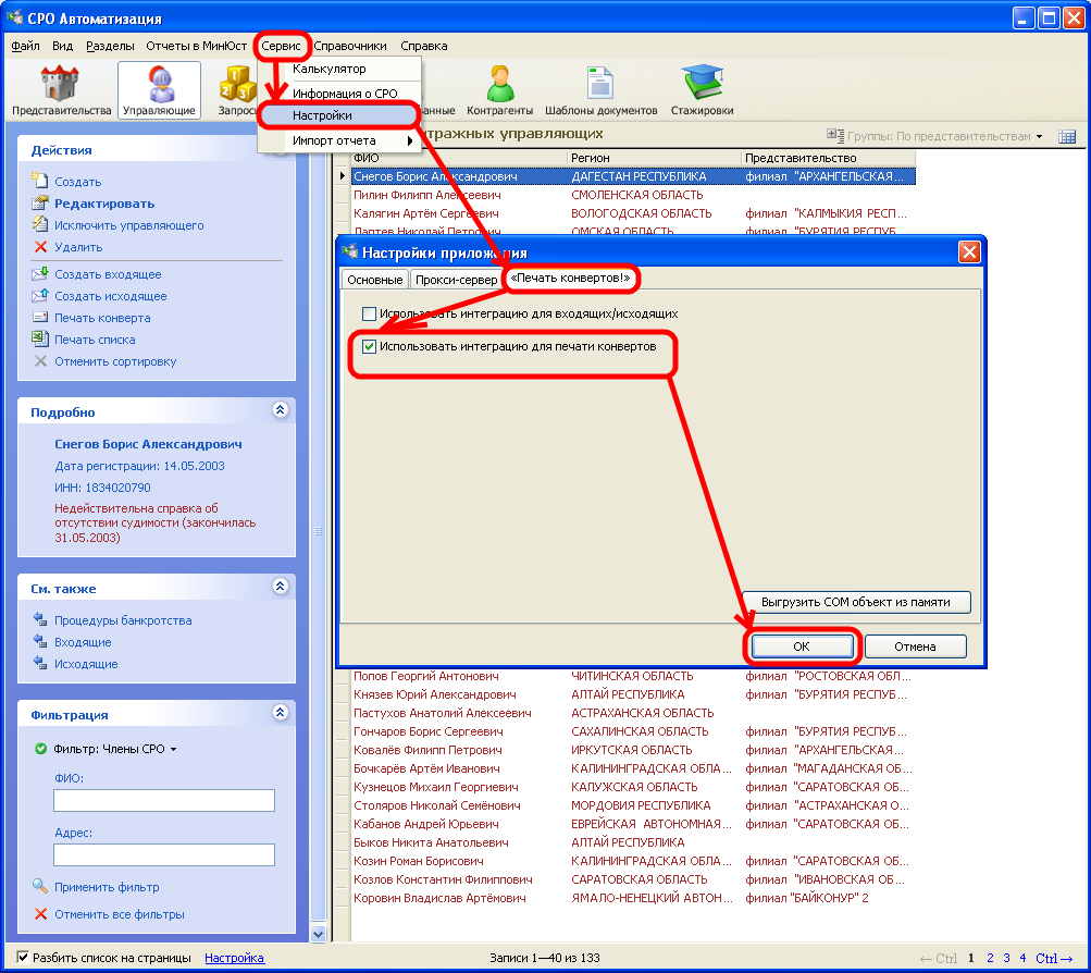 В программе СРО Автоматизация заходим в меню Сервис|Настройки. Переходим на вкладку «Печать конвертов!». Ставим галочку напротив пункта "Использовать интеграцию для печати конвертов". Нажимаем Ок.