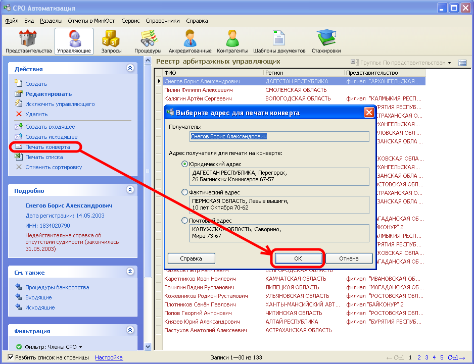 При нажатии в СРО Автоматизация Печать конверта, автоматически запускается форма выбора адреса. Выберите Печать конверта. Проверьте все ли данные верные, выберите адрес, на который следует отправить письмо. Нажмите Ок.