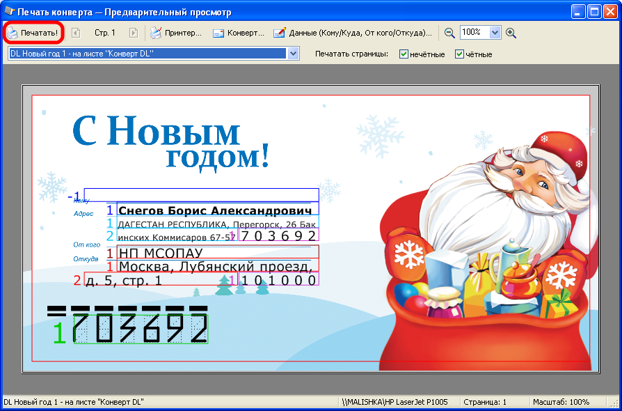 Автоматически запустится программа «Печать конвертов!». Откроется окно предварительного просмотра конверта. Если все в порядке нажмите Печатать.