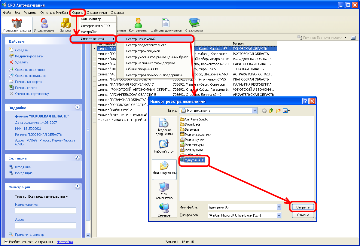 Для того, чтобы быстро начать работу в программе «СРО Автоматизация», можно импортировать отчеты, которые саморегулируемые организации готовят для подачи в Министерство юстиции. Для этого в программе нужно в верхнем горизонтальном меню выбрать Сервис|Импорт отчета. В выпадающем списке выбрать отчет, который необходимо импортировать. Появится окно выбора файла, выберите нужный отчет в формате *.xls и нажмите Открыть.