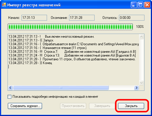 Подождите, пока закончится импорт файла. Нажмите Закрыть.
