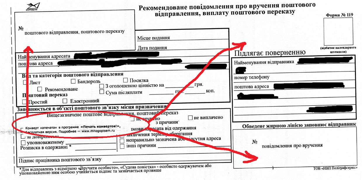 Спасибо конечно за бланк но, программа распознает его как конверт. А в конверте есть надпись (бесплатная версия и все такое). Я совсем не против, но она стоит в том месте где расположены поля для отметки почтовым отделением и закрывает их. Вот если бы была возможность передвинуть эту надпись в другое место.