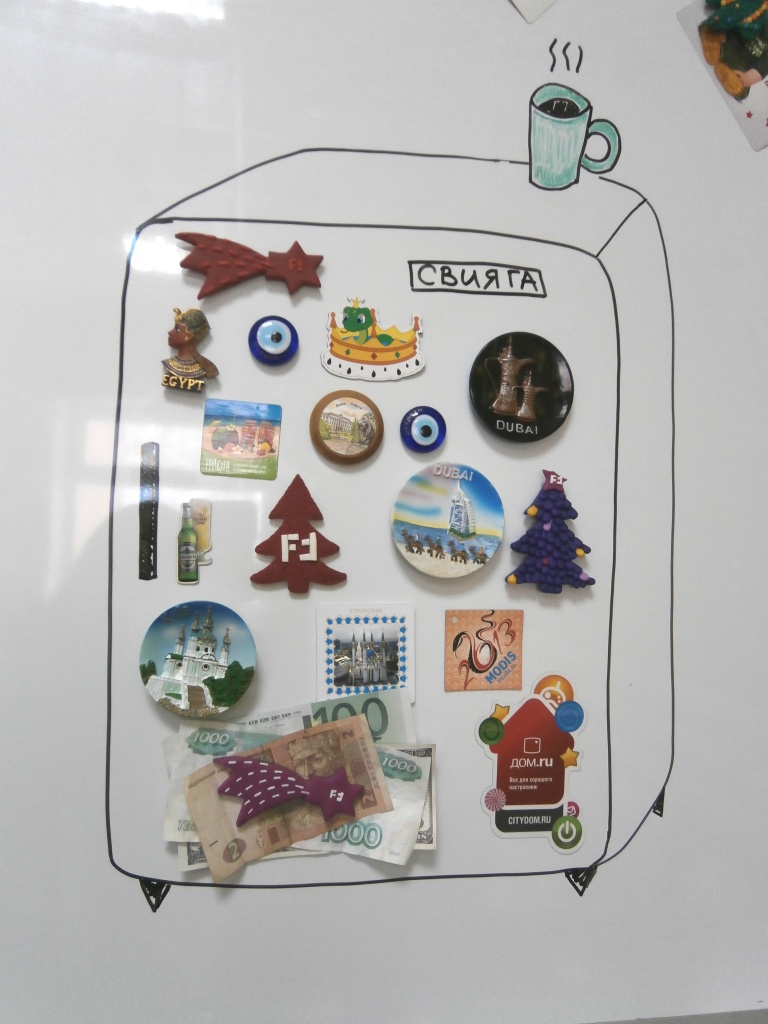 Мы не знаем и наверняка никогда не узнаем, что хранится в этом холодильнике. Но абсолютно точно известно, что дверца холодильника лучшее место для хранения магнитов, лучше чем доска. Творчество отдела продаж.