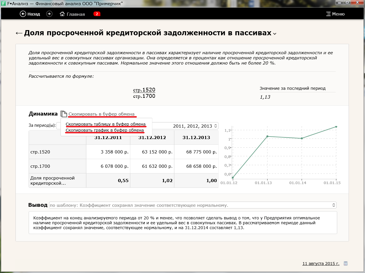 Да, для этого нужно зайти в свойства интересующего вас коэффициента. Это можно сделать во вкладке "Все коэффициенты". На экране вы увидите описание коэффициента, формулу, по которой он высчитывается, динамику изменения значения коэффициента и вывод. Динамика включает в себя таблицу и график. Чтобы их скопировать нажмите на надпись "Скопировать в буфер обмена" и выберите, что вы хотите скопировать, таблицу или график. После этого откройте документ и вставьте данные из буфера обмена любым удобным способом, например, с помощью комбинации клавиш Ctrl+V или кликнув правой кнопкой мыши и выбрав "Вставить".