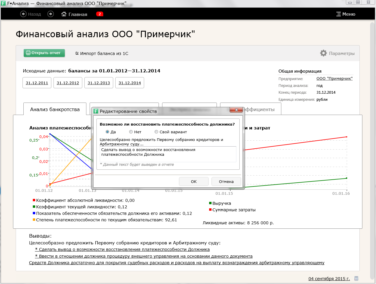 Программа анализирует полученные значения коэффициентов и подставляет наиболее рациональный вывод. Выводы можно редактировать, как в самой программе, так и в готовом отчёте.
