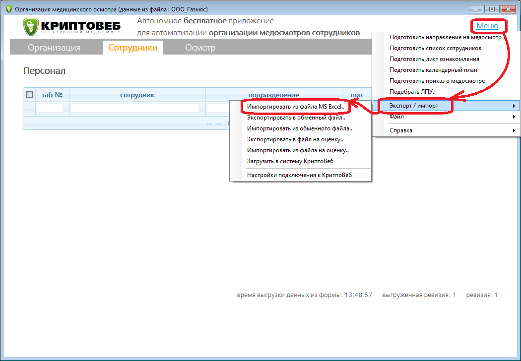 Чтобы добавить данные из подготовленного Excel файла, необходимо в главном меню программы нужно выбрать пункт