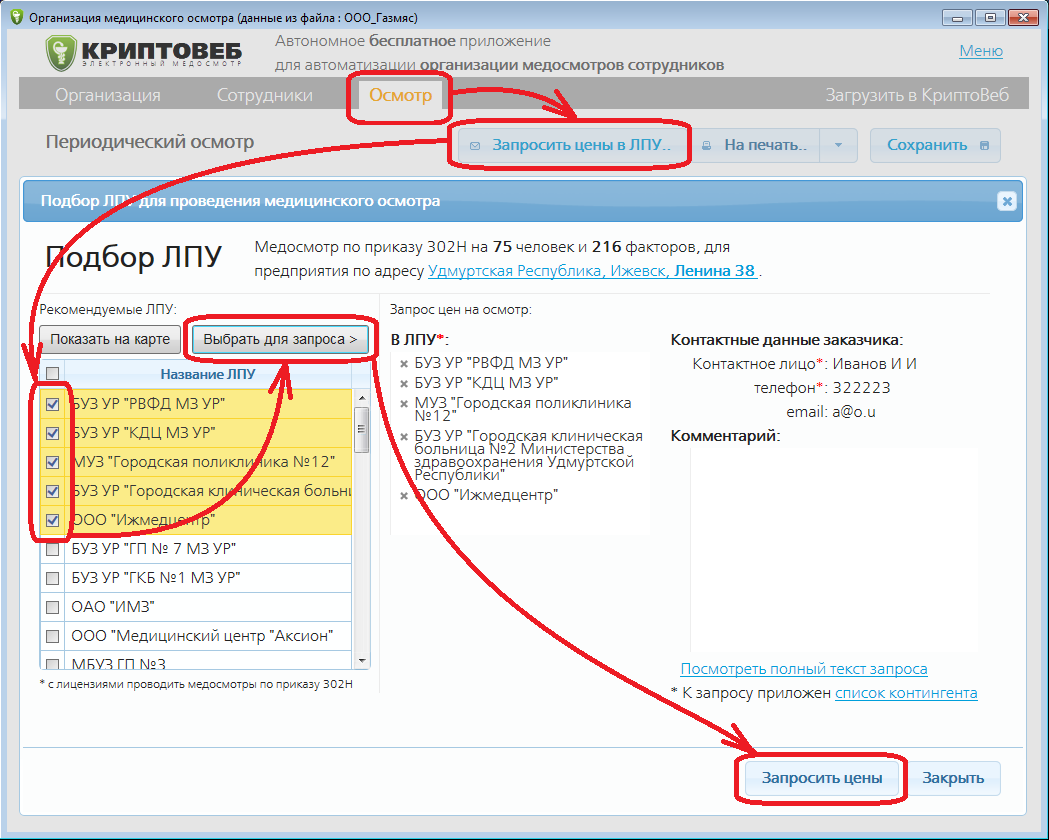 - После того как выбранные все необходимые ЛПУ для осмотра, проверены и введены все необходимые поля, нажать кнопку "Запросить цены"