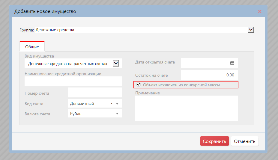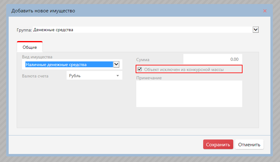 Да, эта функция реализована. Для того, что бы её увидеть нужно перейти в раздел "Имущество гражданина", создать новый объект конкурсной массы, выбрать группу "Денежные средства" и на форме свойств объекта конкурсной массы установить галочку.maximlex писал(а):kravtsov_dv писал(а):На данный момент, исключить денежные средства в программе "Помощник арбитражного управляющего" из конкурсной массы должника нельзя.