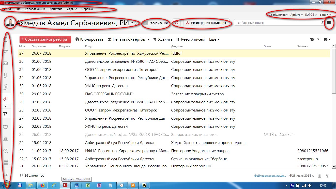 5. Во-первых, в синей строке так и написано «Помощник Арбитражного управляющего». Вы не поверите, но я и так знаю, что за программой пользуюсь. Во-вторых, огромное жирное название предприятия, бесполезно занимающее вокруг себя кучу места. Первое убрать, второе наверх. Освободившееся место использовать под кнопки для оперативной работы.