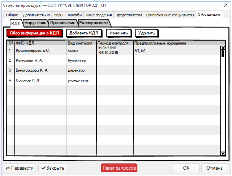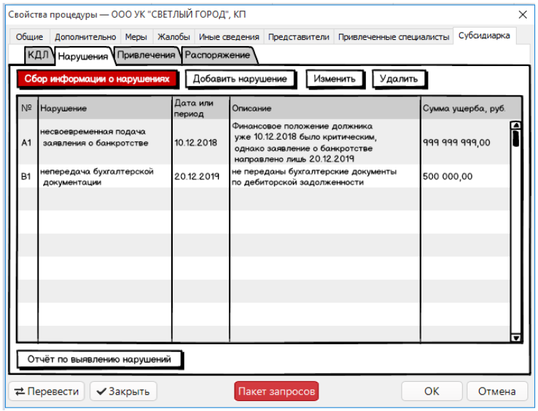 Пока можно прикинуть, что у нас получается. Существующий в свойствах процедуры раздел субсидиарной ответственности должен быть существенно расширен.. Сейчас в нём можно отметить только тех кого уже привлекли, для того чтобы сформировать соответствующую табличку в отчёте АУ. А нужно бы по идее начать работу ещё до этого.