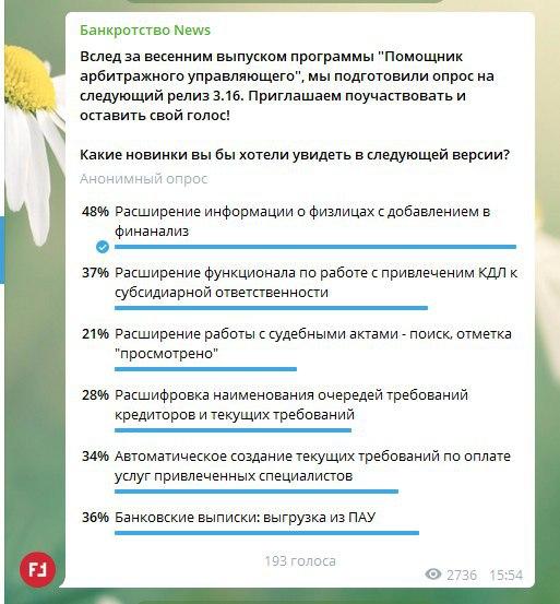 Провели голосование по желаемым улучшениям в новой версии 3.16 во вконтакте и в нашей группе на телеграмме: https://t.me/bankrotnews