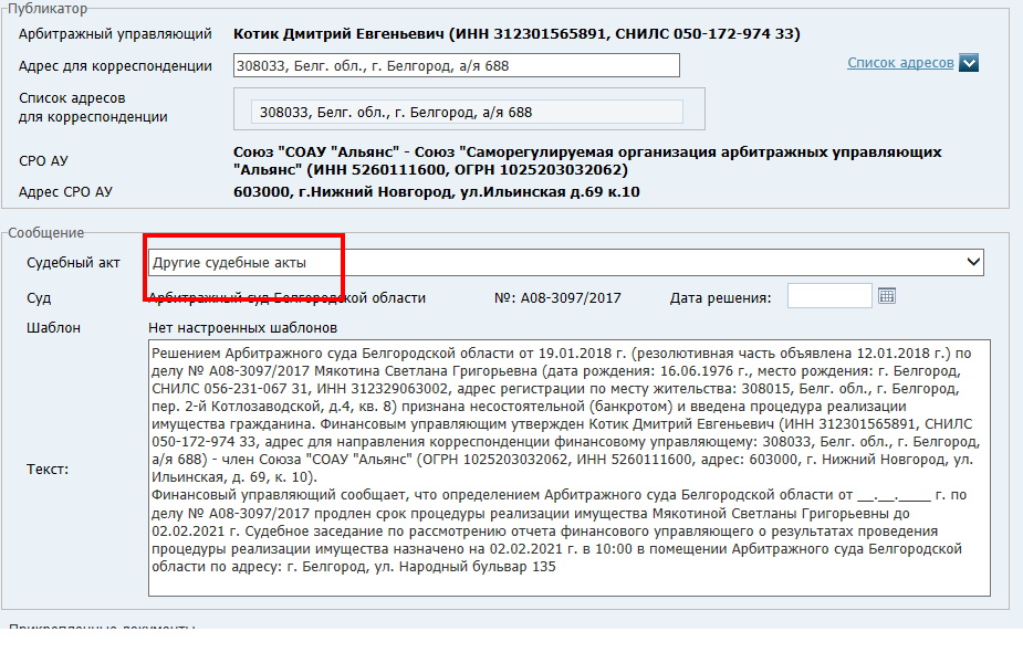 Раньше для объявлений о продлении процедуры не было специального раздела в "Судебных актах" и объявление печаталось в "Другие судебные акты".