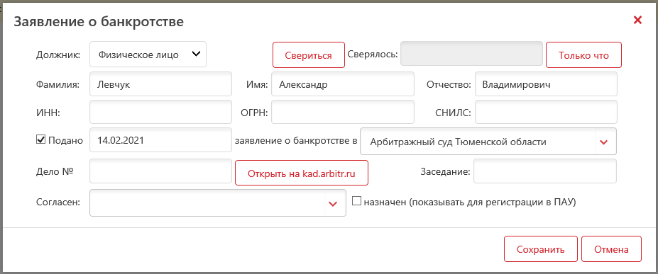 Автоматическая сверка: существенную часть времени при работе сотрудников команды АУ приходится тратить на отслеживание открытого на kad.arbitr.ru дела, запись номера дела и даты заседания о рассмотрении. Для облегчения этой работы в карточке заявления реализована специальная кнопка “Свериться”, которая проверяет новую информацию на сайте kad.arbitr.ru автоматически. Кроме того, витрина автоматически “в фоновом” режиме (без каких либо действия пользователя) осуществляет сверку каждый час.