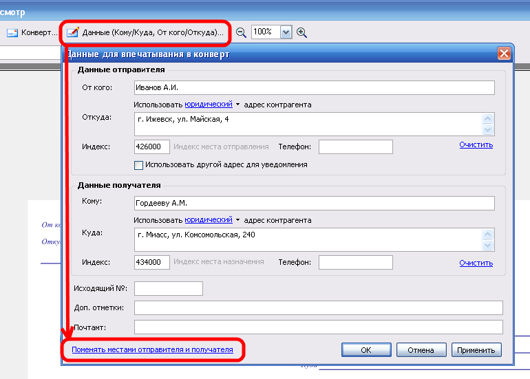 Для того, чтобы при печати конверта сразу распечатать конверт с обратным адресом в программе предусмотрена функция "Поменять местами отправителя и получателя".