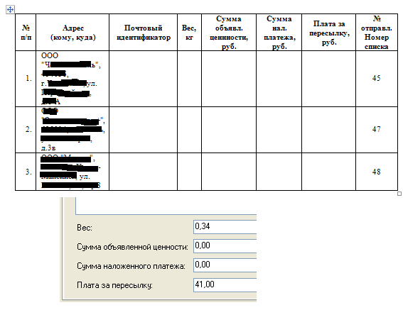 Добрый день. При печати и/или сохранении реестра писем не заполняются поля масса/цена ни в одной форме. В записи письма вес/цена указаны. Дело в настройке, или функция не поддерживается? Скрин прилагается.