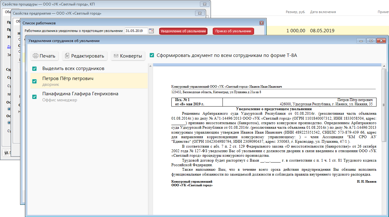 • Сформировать уведомление об увольнении
