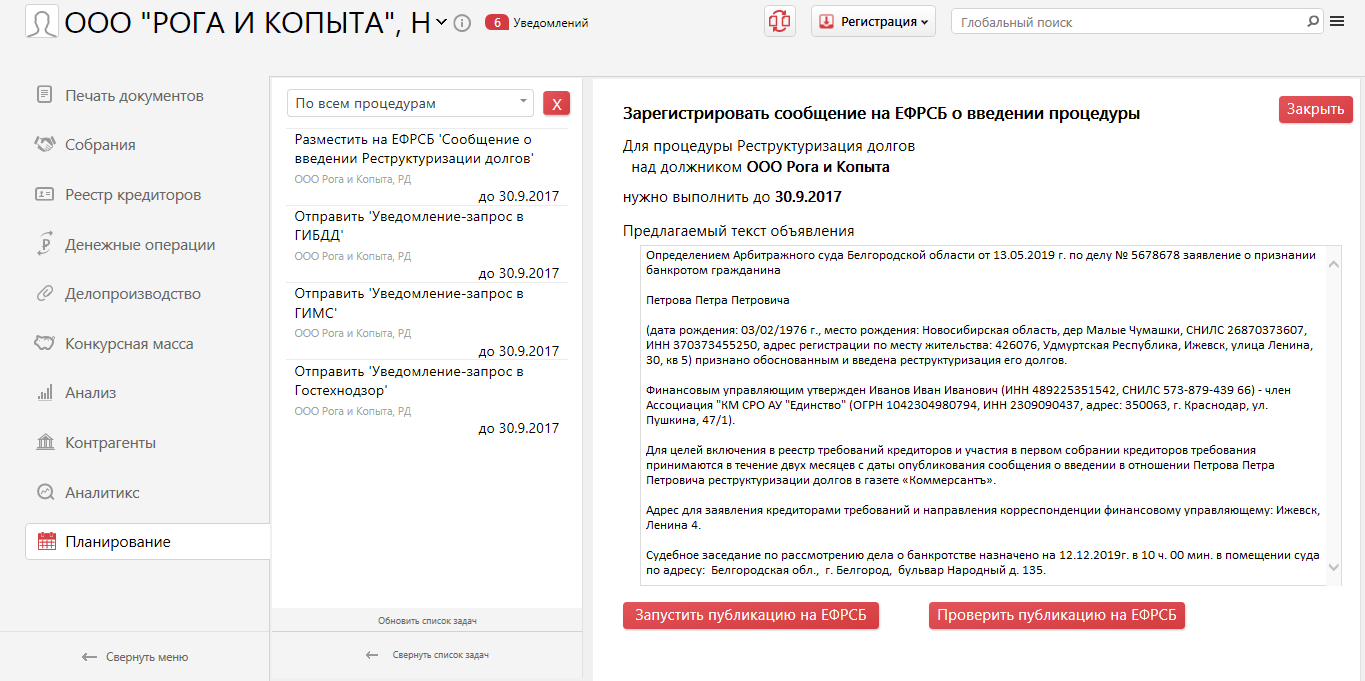 Причём для такой задачи недостаточно просто нажать кнопку "выполнил". Именно для неё мы добавили в прошлой версии получение сообщений с ЕФРСБ.